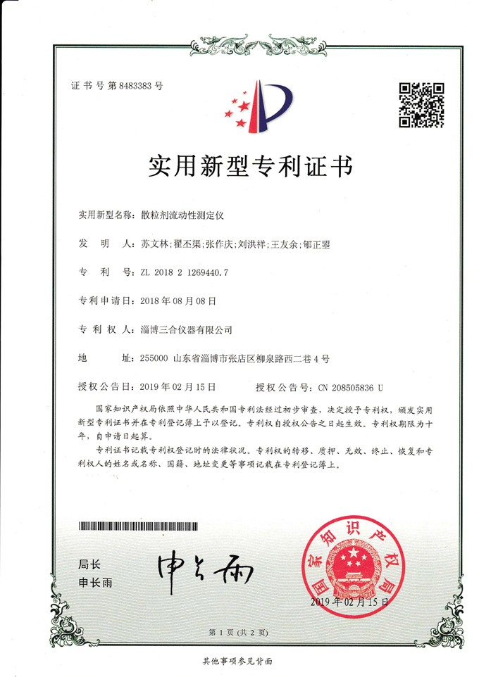 近日,我公司研發(fā)的《散粒劑流動性測定儀》已通過國家知識產(chǎn)權(quán)局的審批,獲得實(shí)用新型專利授權(quán)。這是繼《絕緣油恒溫取樣箱》取得專利之后,公司所獲得的又一項(xiàng)實(shí)用新型專利授權(quán)。